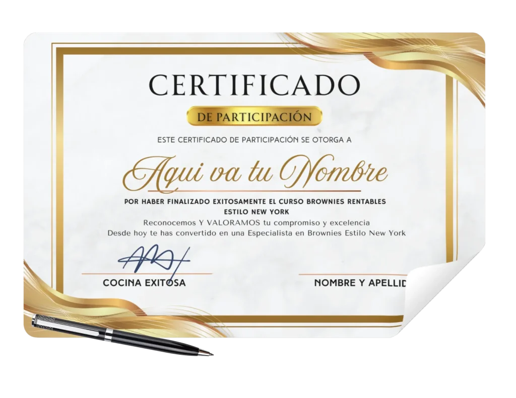 Al completar los 8 días de nuestro programa, celebraremos tu disciplina y dedicación con un certificado oficial personalizado con tu nombre. Este reconocimiento te llegará directamente a tu correo electrónico, listo para descargar, imprimir o compartir como prueba de tu logro y tu nueva habilidad como creadora de Brownies Estilo New York.